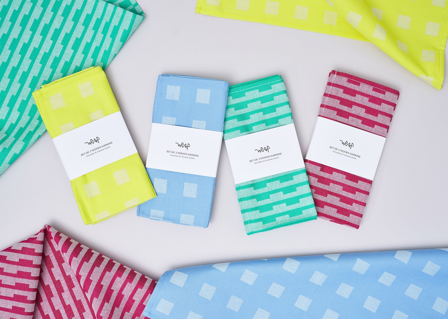 The Corner Shop collection for Wrap celebrates the everyday objects commonly found in diasporic corner shops and in Brixton Market: Neon price tags, gridded dish cloths, marbled plastic stools and multicoloured bindis. These superficially mundane, mass-produced objects, take on a different character when abstracted and re-composed as chromatic patterns on stationery, textiles and objects for the home.